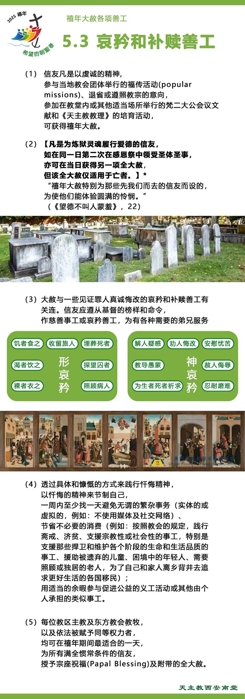 获得大赦的另一种方式当然是通过“证实自己的悔改的慈悲善工及忏悔”。信徒们“效法基督的榜样和使命”,被激励“更经常地从事慈善或慈悲善功,主要为那些因各种需要而负担沉重的兄弟姐妹服务”。同样,如果他们去探望“有需要或处于困境中的弟兄姐妹们(病人、服刑、孤独长者、残障人士...等),就如同朝圣到临在他们身上的基督那里”。
