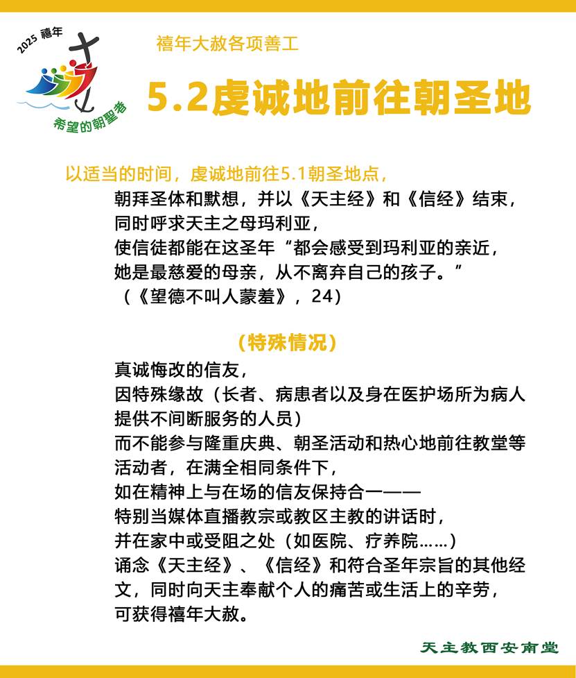 因重大原因“真心悔改但无法参加庆典或朝圣的信徒”,只要“在自己家中或受限的地方,诵念天主经、任何合法形式的信仰宣誓和其他符合圣年目标的祈祷,献上自己的痛苦或生活艰辛”,就能在同样的条件下获得禧年大赦。