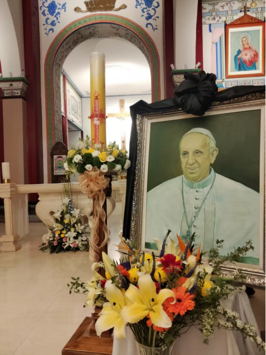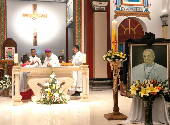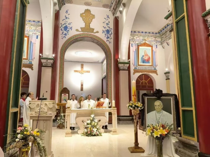 西安教区主教党明彦、南堂各位司铎在当晚南堂举行的弥撒中,与闻讯赶来的信友,共同缅怀并为教宗方济各祈祷。